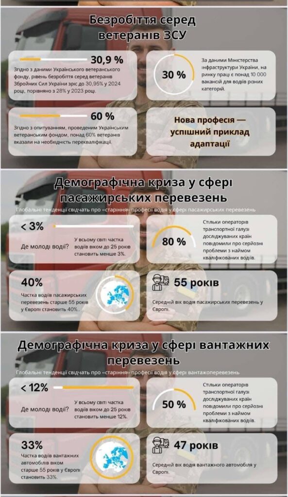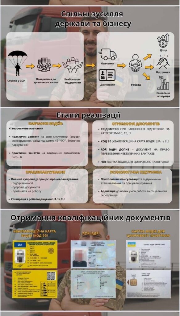 Впроваджується програма, що допомагає ветеранам опанувати нову професію — зокрема, водія комерційного транспорту, логіста, механіка, диспетчера автопарку та інші суміжні спеціальності.