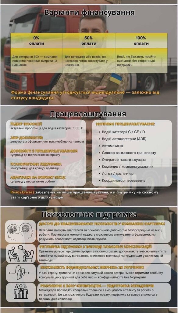 Впроваджується програма, що допомагає ветеранам опанувати нову професію — зокрема, водія комерційного транспорту, логіста, механіка, диспетчера автопарку та інші суміжні спеціальності.