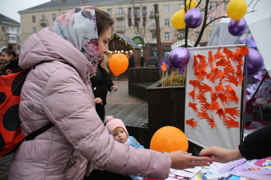 Для дітей підготували приємні сюрпризи — кульки, мандаринки та смаколики оранжевого кольору, що є символом надії та ідеї життя без насильства.
