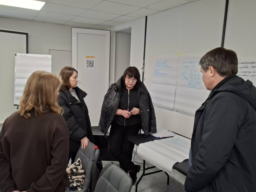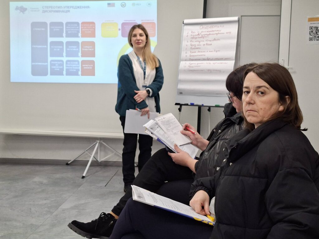 Тренерка заходу Наталя Русакова ознайомила присутніх із практичними підходами до виявлення можливих проявів дискримінації та ризиків експлуатації, а також наголосила на важливості людиноцентрованого підходу у роботі з внутрішньо переміщеними особами.